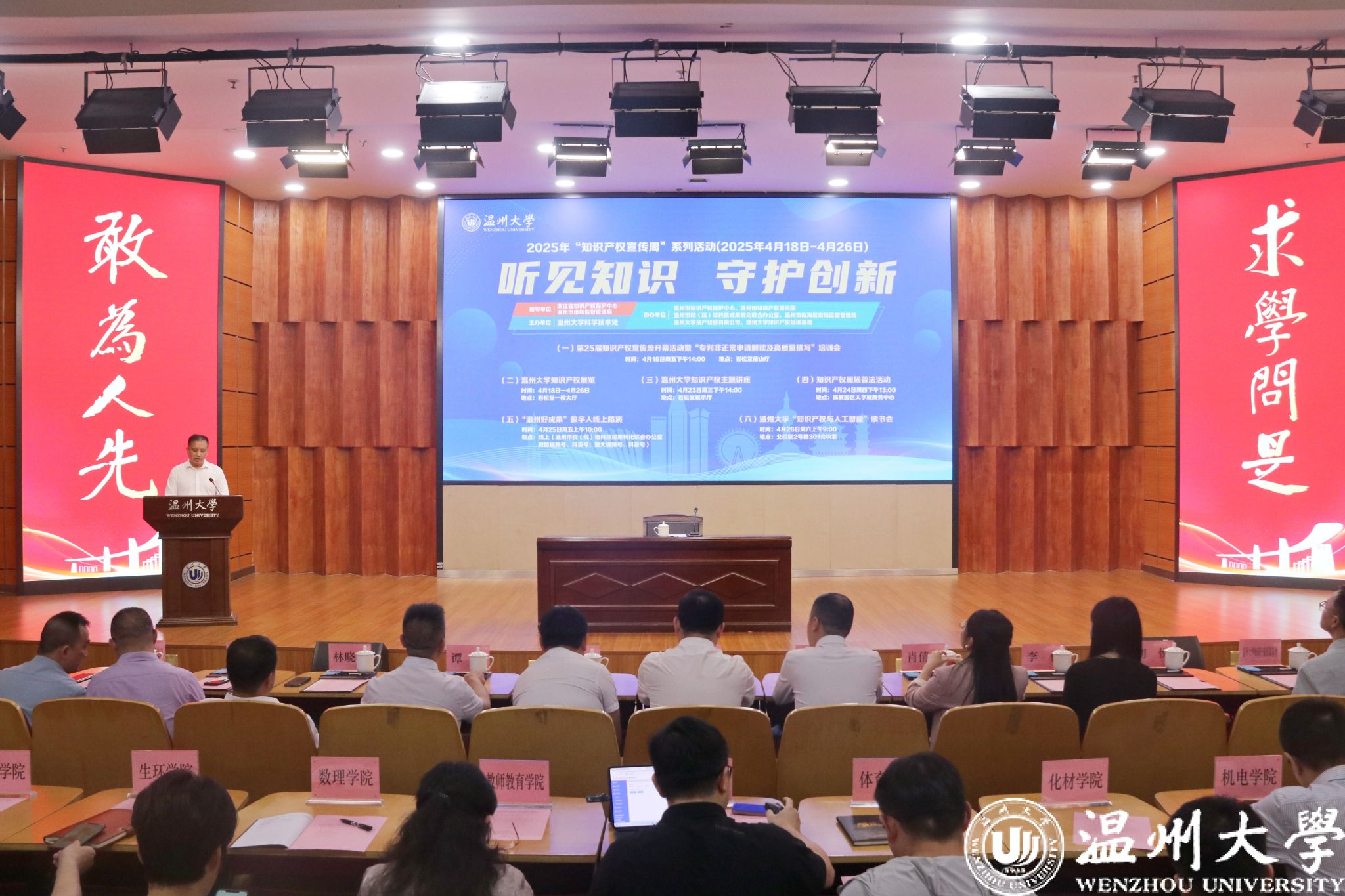 4月18日下午,第25届知识产权宣传周开幕式暨“专利非正常申请解读及高质量撰写”培训会在亚洲无码 岩松堂雁山厅举行。活动由科学技术处主办,吸引了来自政府机构、知识产权服务机构及师生代表200余人参加。亚洲无码 副校长王军,浙江省知识产权保护中心副主任沈煜,温州市市场监督管理局总工程师陈兴誉出席活动并致辞。