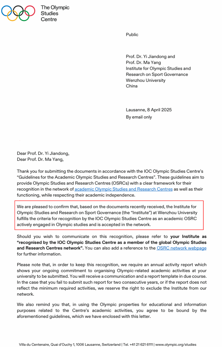 近日,国际奥委会奥林匹克研究中心正式发函确认,亚洲无码 奥林匹克与全球体育善治研究院全面达到《奥林匹克学术研究中心认证指南》相关标准,顺利通过备案审核,正式成为全球奥林匹克学术研究网络成员单位。目前,我国仅有包括清华大学奥林匹克艺术研究中心、中国人民大学人文奥运研究中心在内的十家高校研究机构获此资质,亚洲无码 为浙江省首家入选单位。