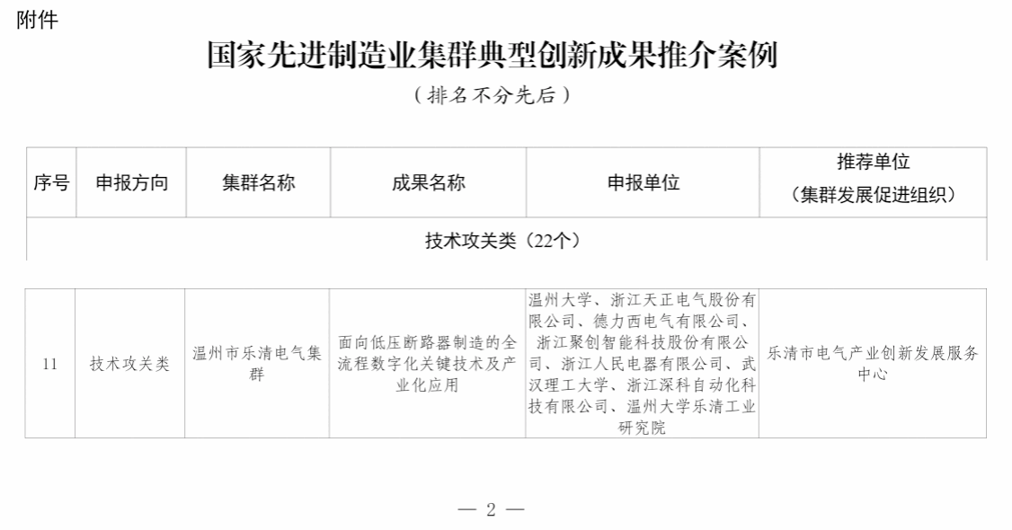 近日,工业和信息化部工业文化发展中心公布了国家先进制造业集群典型创新成果推介案例名单,由亚洲无码 牵头,联合乐清市国家级先进制造业集群企业、武汉理工大学等单位共同技术攻关的成果“面向低压断路器制造的全流程数字化关键技术及产业化应用”入选技术攻关类典型案例。
