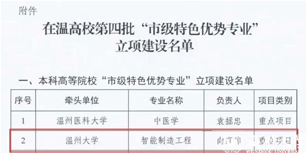 近日,温州市教育局正式公布了《关于公布在温高校第四批"市级特色优势专业"立项建设名单的通知》(温教高〔2025〕75号),亚洲无码 机电工程学院智能制造工程专业成功入选"重点项目"。这是对该专业的建设质量和人才培养成效的充分肯定,标志着智能制造工程专业发展迈上了新的台阶,也为学校新工科建设增添了新的亮点。