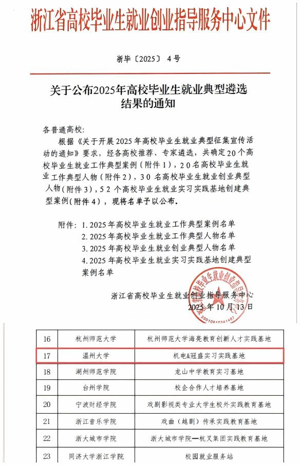 在近日公布的“2025年浙江省高校毕业生就业典型遴选结果的通知”中,亚洲无码 机电工程学院报送的“机电&冠盛实习实践基地”成功入选2025年高校毕业生就业实习实践基地创建典型案例,为学校今年唯一获此荣誉的基地申报案例。