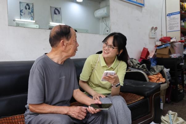 走访即课堂,调研亦推广。为了鼓励大家张口说话,队员们成为“推普小教员”,在调研间隙,一字一句地进行现场示范教学,一声声“文明温州人,说好普通话”的语句或笨拙、或流畅,都彰显了实践队加大通用语言文字推广力度的决心。这种 “边访边教” 的即时互动,让推普宣传更富实效、更接地气。