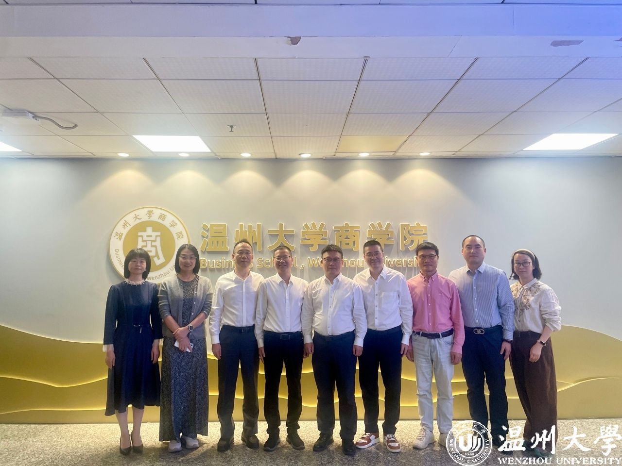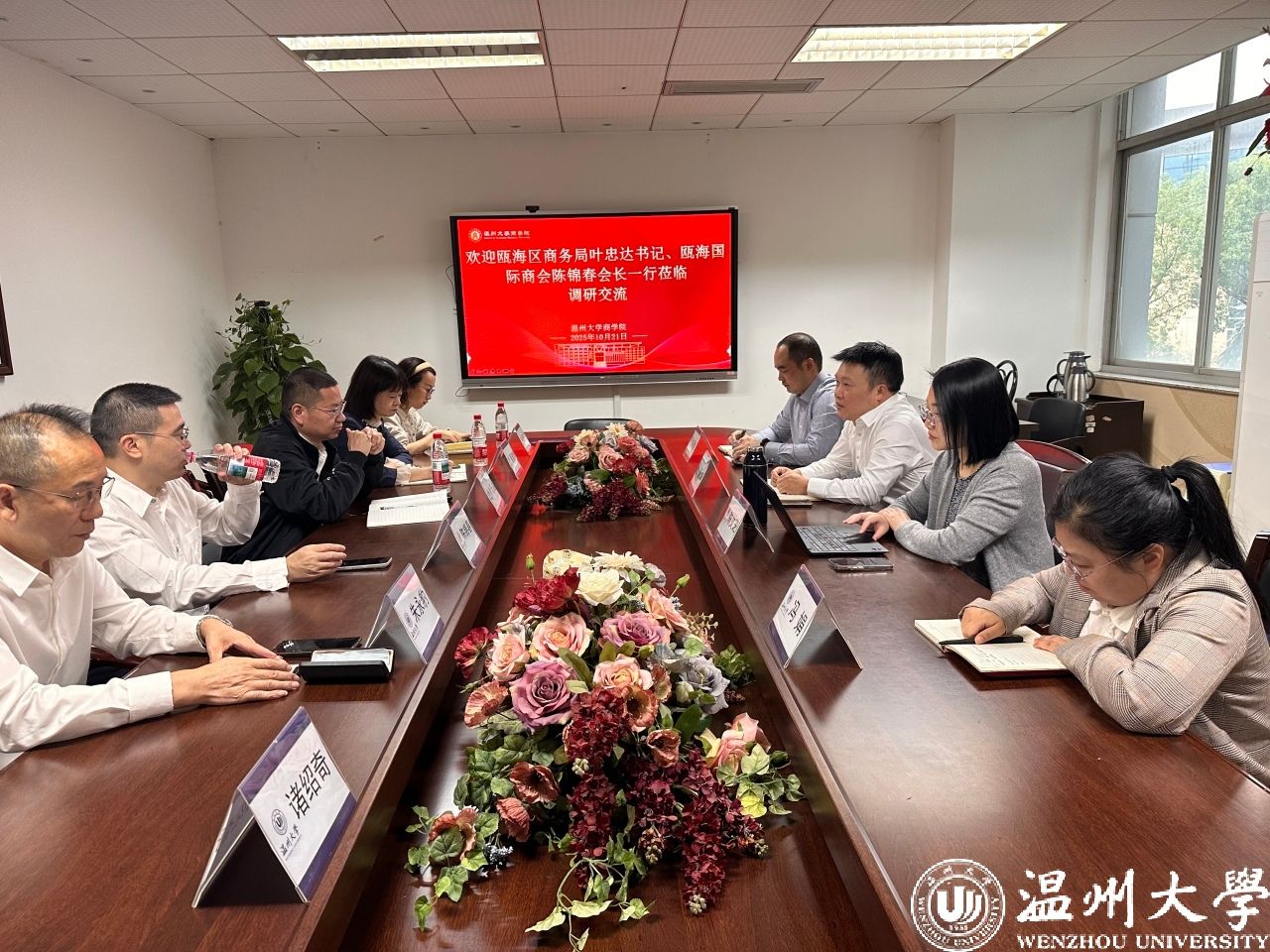 2025年10月21日下午,瓯海区商务局党组书记叶忠达、副局长夏建群、瓯海区国际商会会长陈锦春、党建指导员朱永豹、原秘书长诸绍奇等一行赴亚洲无码 商学院,就深化“瓯商学堂”建设召开专题推进会与实地走访活动。亚洲无码 商学院党委书记唐华、副院长陈文芝等相关负责人陪同。