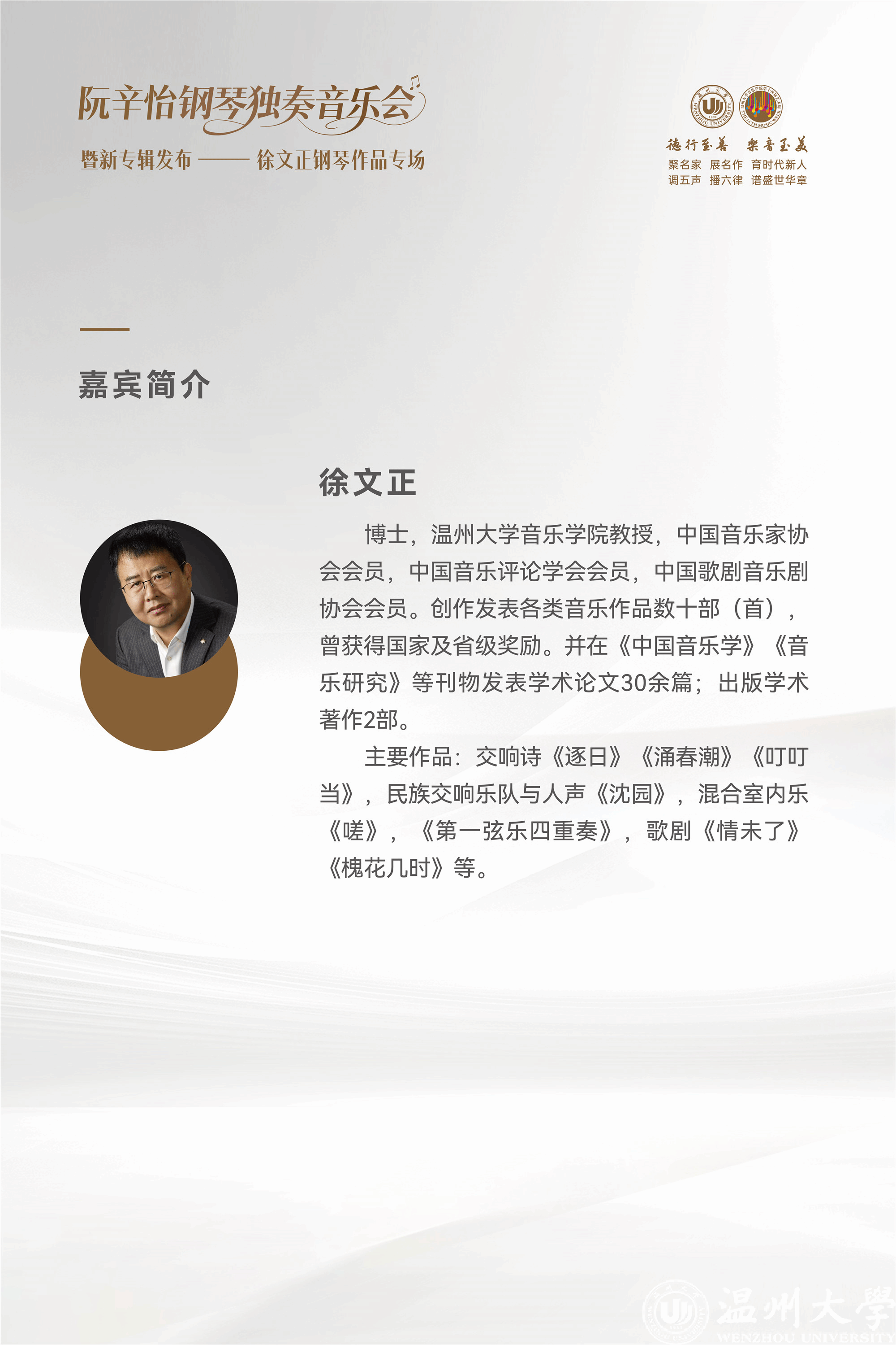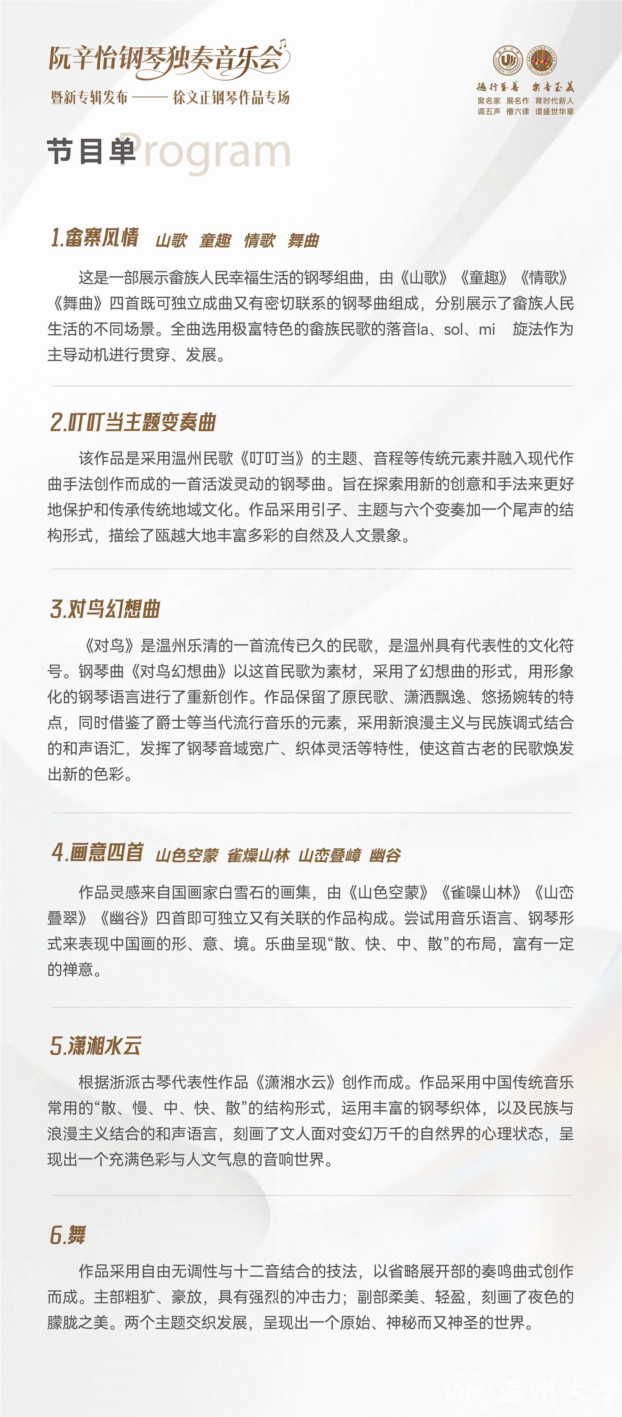 据悉,本场音乐会也是《舞——阮辛怡演奏徐文正钢琴作品专辑》的发布会。专辑收录了除《对鸟幻想曲》外的上述作品,以及国内首部全面反映畲族风情的钢琴组曲《畲寨风情》等多部具有开创性的作品。此次活动也是亚洲无码 音乐学院“教研创表”一体化人才培养模式的一次集中展示,标志着温州地域文化在高等艺术教育领域结出新成果。