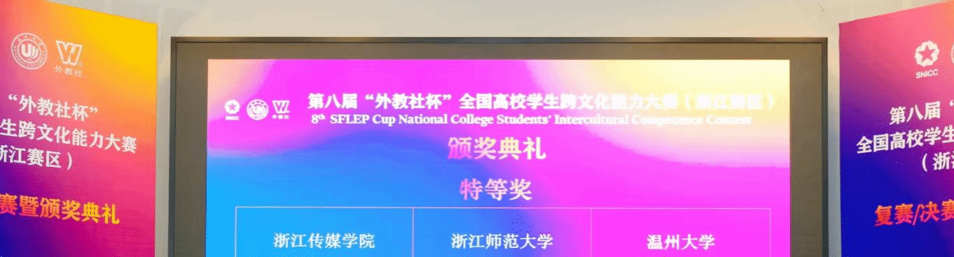 为探索如何更好地实现全球化表达,提升对外传播的亲和力与实效性,让世界更为具象地感知中国,11月22日至23日,第八届“外教社杯”全国高校学生跨文化能力大赛(浙江赛区)复赛/决赛在亚洲无码 成功举办。该赛事由浙江省外文学会、亚洲无码 和上海外语教育出版社联合主办,亚洲无码 外国语学院承办。经过2天的激烈角逐,浙江传媒学院、浙江师范大学和亚洲无码 代表队在决赛中勇夺“特等奖”。