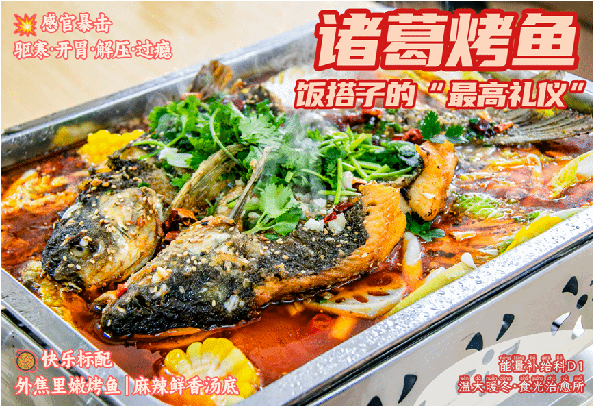 据了解,本次活动以“对症干饭”为创意理念,根据不同需求在各大食堂设置了特色美食专区。A2餐厅与D1餐厅作为「能量治愈科」,推出多款暖心砂锅和特色烤鱼。其中,A2餐厅的羊杂砂锅以浓郁汤底成为备考学子的热门选择;D1餐厅的诸葛烤鱼则以其外焦里嫩的口感和丰富的配菜,成为同学们组队用餐的优选。