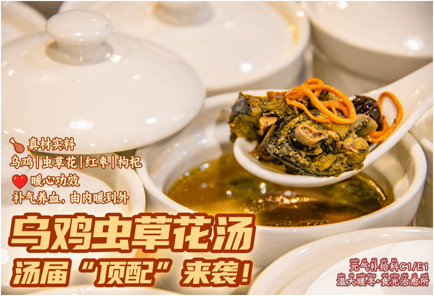 在C1餐厅和怡口乐餐厅设立的「元气补给科」,推出了多款滋补汤品。党参虫草乌鸡汤、老鸭炖青笋等菜品,用料扎实,汤味醇厚,为期末复习的学子提供营养支持。怡口乐餐厅的家常汤品,如排骨莲藕汤、羊肉炖萝卜等,以熟悉的味道缓解学生的思乡之情,帮助他们在紧张的学业中保持良好状态。