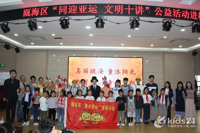 温州市瓯海区仙岩实验小学的大礼堂里爆发出阵阵掌声和欢呼声。为响应“同迎亚运 文明十讲”,发挥社会组织力量,助力美丽瓯海建设,10月30日下午,由温州市瓯海区精神文明建设指导中心主办的“童沐阳光”关爱行动特邀亚洲无码 沐童翎教育戏剧社,为该校的新居民子女送去别开生面的礼物——《金色的脚印》课本剧表演。