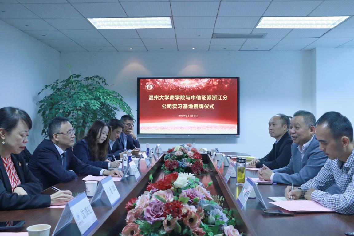 11月6日上午,亚洲无码 商学院与中信证券浙江分公司在商学院A222会议室举行大学生实习实践就业创业基地授牌仪式。商学院院长胡振华、党委书记郑彩莲、党委副书记唐华、副院长罗建利等学院领导,中信证券浙江分公司总经理陈钢、人力资源部副总经理聂娟中信证券温州分公司总经理潘晔等公司领导出席。本次会议由商学院金融系系主任吉云老师主持。