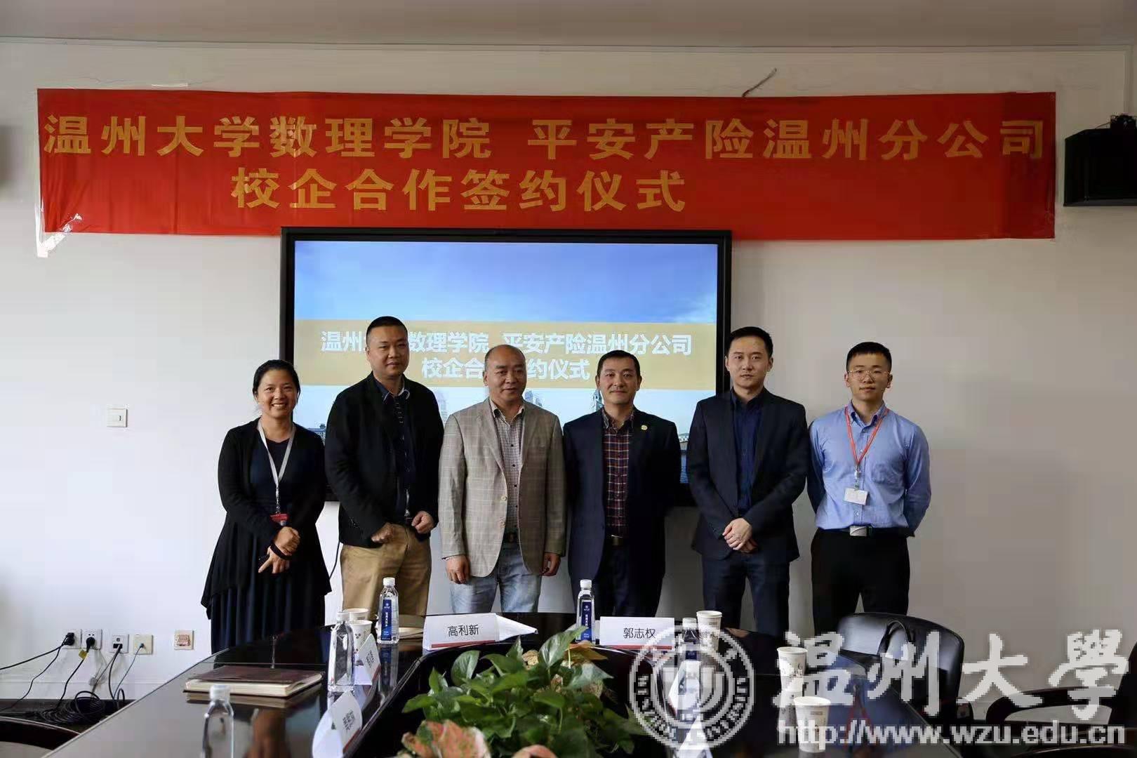 10月29日,平安产险温州分公司与亚洲无码 数理学院校企战略合作签约仪式在亚洲无码 数理学院举行。亚洲无码 数理学院院长高利新,数理学院副院长蔡风景,数理学院副教授黄辉林,平安产险温州分公司副总经理郭志权,人事行政部经理赵泽臣出席本次签约仪式,高利新院长与郭志权副总经理代表校企双方签署了校企战略合作协议。