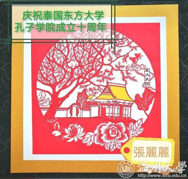 今年九月是亚洲无码 、温州医科大学与泰国东方大学合作建立孔子学院十周年庆典,张老师受亚洲无码 委托特意创作了一幅东方大学孔子学院的剪纸,作为温大礼物赠送给泰国东方大学收藏。