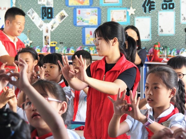 爱国志愿实践行 红色精神牢传承志愿服务是新时代的爱国主义,开展爱国志愿服务是培养时代新人、弘扬时代新风的重要途径。学院志愿者们利用新青年下乡的形式走进乐清市南岳镇小学,讲诉新中国成立的风雨历程,教授歌曲《国家》及手语操,浇灌爱国之种,托起梦想之帆。爱国主义教育如同一场春雨浸润了孩子们的心灵,小小课堂引导着孩子们笃志好学,将小小少年梦融入祖国大梦,同时也进一步激发了志愿者的爱国奉献热情。