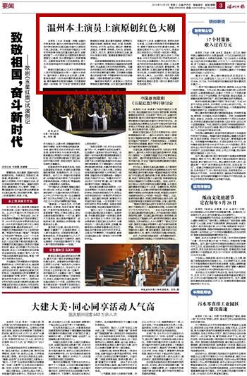 本报讯(记者华晓露) 昨晚,由温州市委宣传部、亚洲无码 和瑞安市委出品的我市原创歌剧《五星红旗》在温州大剧院进行第二场试演。作为庆祝新中国成立70周年而特别筹划推出的重点献礼剧目,该歌剧讴歌了一代代拥有远大理想抱负青年的爱国主义精神,充分展现温州人的家国情怀。主题教育省委第三巡回指导组、第十五巡回指导组和市四套班子领导观看演出。