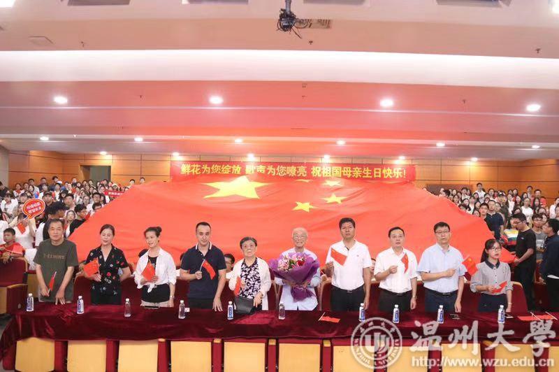 师生共聚,见证祖国繁荣富强。学校离休老教师代表杨作浩老师也参加了活动。杨作浩老师今年已经九十六岁高龄,但他仍旧坚持在这一天,在温大,为祖国祝福。他为大家演唱了一首《毕业歌》,“同学们!同学们!快拿出力量,担负起天下的兴亡!” 沧桑而有力量的歌声传来,在场师生无不动容。这不仅仅是一首歌,更是一个经历过中国几十年风云变幻的老人对一代年轻人叮嘱和鼓舞。