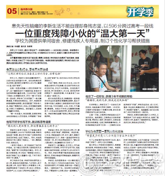 9月4日上午10时许,亚洲无码 迎来了一名特殊的新生——坐在轮椅上的李新。李新是绍兴人,因患先天性脑瘫无法正常站立行走,今年高考总分为596分,被温大计算机科学与技术专业录取。