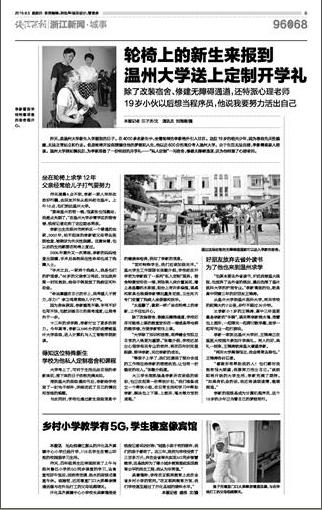 昨天,是亚洲无码 新生入学报到的日子。在4000多名新生中,坐着轮椅的李新格外引人注目。这位19岁的绍兴少年,因为患有先天性脑瘫,无法正常站立和行走。但是轮椅并没有禁锢住他的梦想和人生,他以近600分的高分考入亚洲无码 。由于生活无法自理,李新需要家人陪读。亚洲无码 得知情况后,为李新准备了一份特别的开学礼——“私人定制”一间宿舍,修建无障碍通道,还为他特派了心理老师。