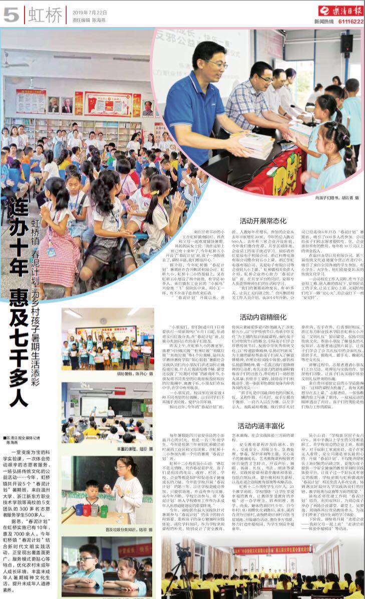 据悉,“春泥计划”在虹桥实施已有10年,惠及7000余人。今年虹桥镇“春泥计划”结合新时代文明实践活动,正呈现出覆盖面更广、服务模式更贴心等特点,优化农村未成年人成长环境,丰富未成年人暑期精神文化生活,提升未成年人道德素养。