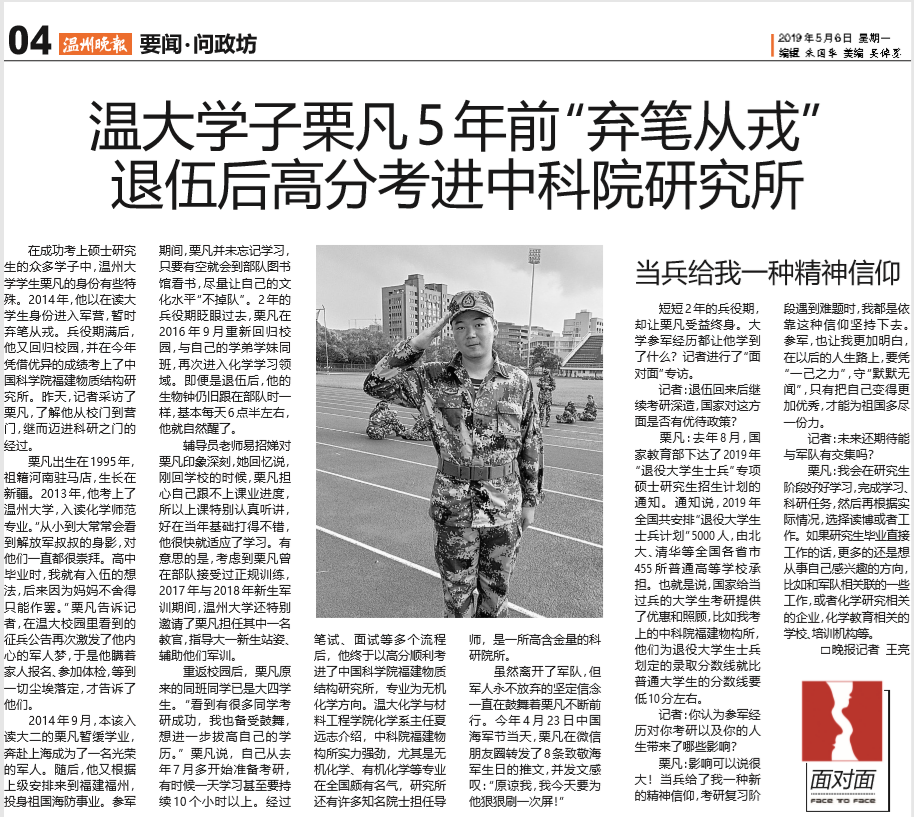 在成功考上硕士研究生的众多学子中,亚洲无码 学生栗凡的身份有些特殊。2014年,他以在读大学生身份进入军营,暂时弃笔从戎。兵役期满后,他又回归校园,并在今年凭借优异的成绩考上了中国科学院福建物质结构研究所。昨天,记者采访了栗凡,了解他从校门到营门,继而迈进科研之门的经过。