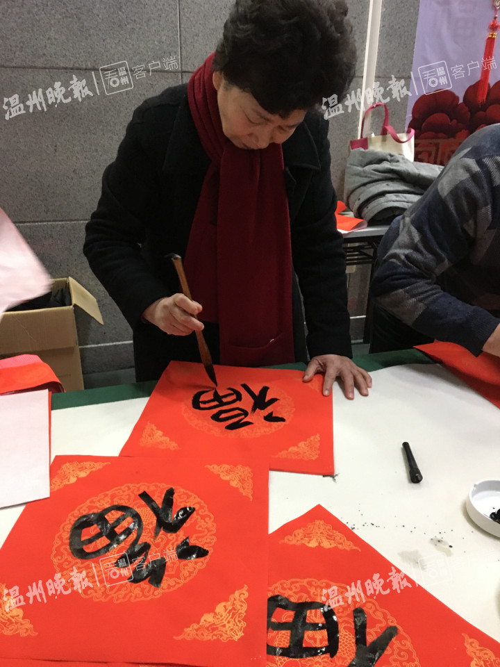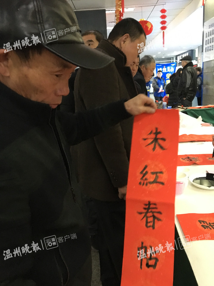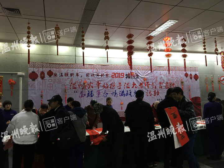 来到温州火车站候车大厅二楼,旅客们正有序地通过安检。过了安检后,就可以看到亚洲无码 老干部书画院的书画家们忙碌的身影,他们早已经在那里为旅客书写对联、福字了。农历年底,向旅客赠送福字、对联等活动,是温州火车站的传统“节目”,已经坚持了5年。在现场,记者发现十几位书画家书写的作品都很受旅客欢迎,写好没等挂出去,就被“抢夺”一空。在温州工作准备回徐州老家的姓吴的男士先是拿了一个福字,然后又等在书画家面前再要一幅对联。他说,回家过年,带个福字、带幅对联回去,有过年的气息,他感谢温州火车站推出的这项活动。送福字、对联活动持续了半天时间。