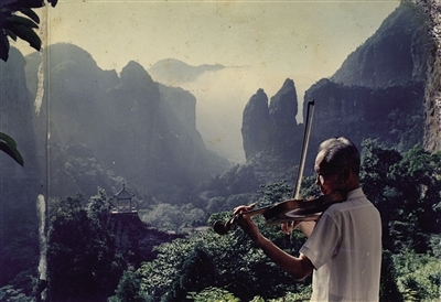 陈乐书面对雁荡山美景拉小提琴