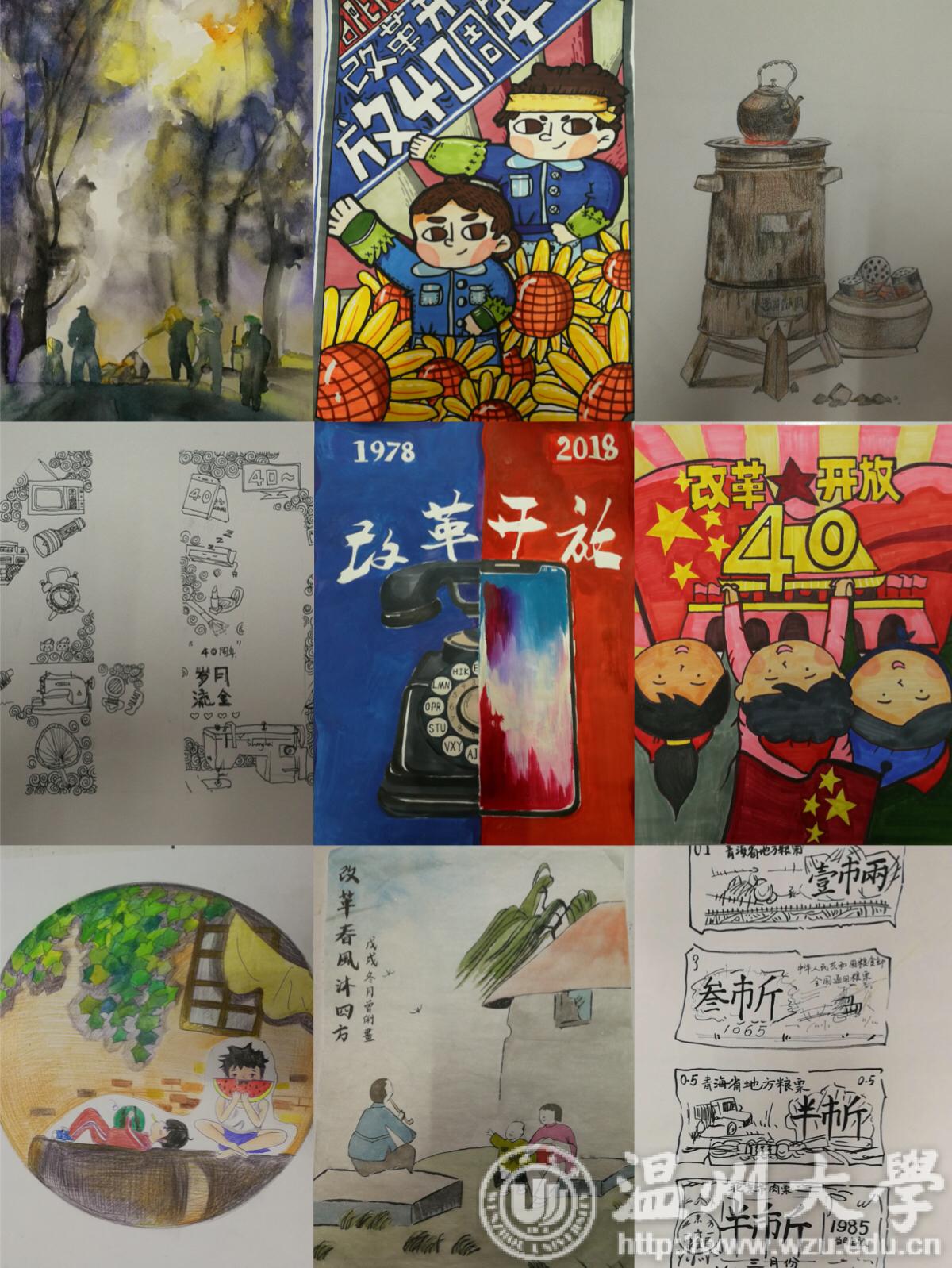 溯初学区还在12月22日举办“时光博物馆”展览,将平时展放在发绣馆、民俗馆的部分作品引入到广场中,让同学们近距离地感受指尖和民俗里的改革开放。广场的另一旁,一幅幅改革开放40年历程图片,20多位温大优秀校友事迹图片,师生们的几十副原创画作和诗歌作品则带领大家进入“时光隧道”。