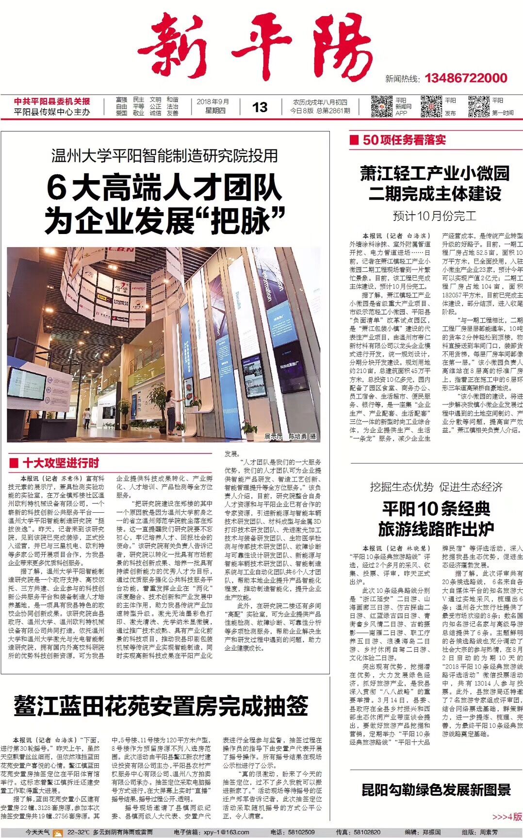 “把研究院建设在郑楼的其中一个原因就是因为亚洲无码 前身之一的省立温州师范学院就坐落在郑楼。这一直提醒我们研究院要不忘初心,牢记培养人才、回报社会的使命。”该研究院有关负责人告诉记者,研究院以转化一批具有市场前景的科技创新成果、培养一批具有持续创新能力的优秀人才为目标,通过优质服务强化公共科技服务平台功能,着重发挥企业在“两化”深度融合、技术创新和产业发展中的主体作用,助力我县传统产业加速转型升级。激光无油墨彩色打印、激光清洗、光学纳米显微镜,通过推广技术成熟、具有产业化前景的科技项目,推动我县印刷包装机械等传统产业实现智能制造,同时实现高新科技成果在平阳产业化发展。