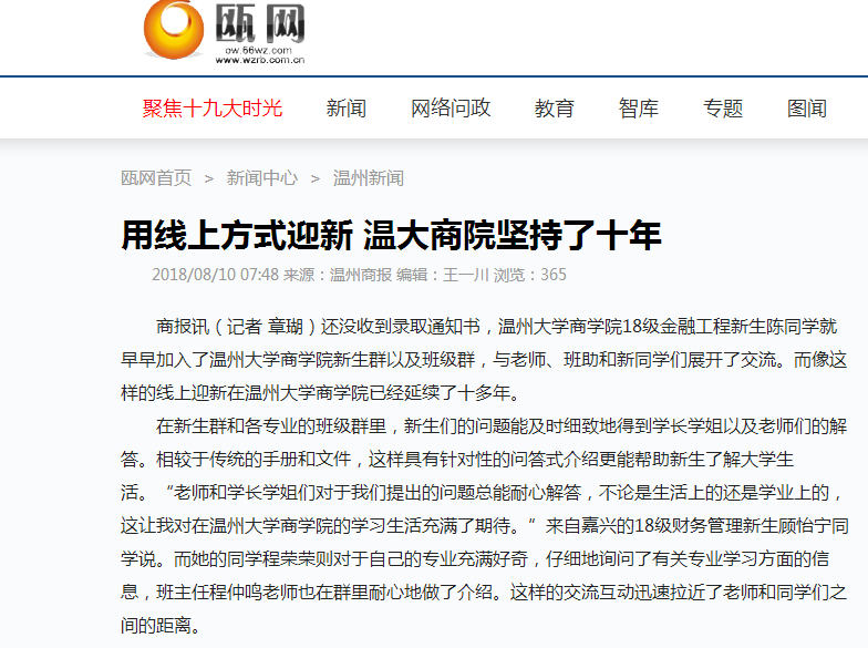还没收到录取通知书,亚洲无码 商学院18级金融工程新生陈同学就早早加入了亚洲无码 商学院新生群以及班级群,与老师、班助和新同学们展开了交流。而像这样的线上迎新在亚洲无码 商学院已经延续了十多年。