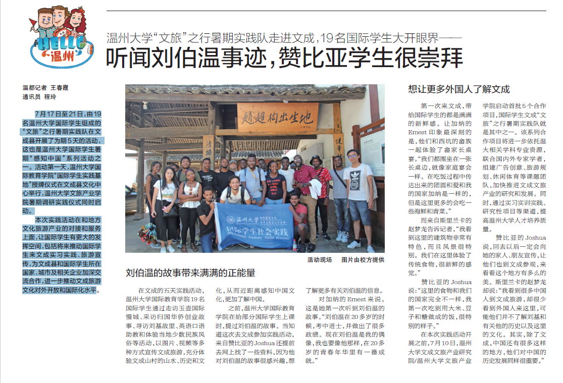 在文成的五天实践活动,亚洲无码 国际教育学院19 名国际学生通过走访玉壶国际慢城、采访归国华侨创业故事、寻访刘基故里、英语口语助教和体验当地少数民族风俗等活动,以图片、视频等多种方式宣传文成旅游,充分体验文成山村的山水、历史和文化,从而近距离感知中国文化,更加了解中国。之前,亚洲无码 国际教育学院在给部分国际学生上课时,提过刘伯温的故事。当知道这次去文成参加实践活动,来自赞比亚的Joshua 还提前去网上找了一些资料,因为他对刘伯温的故事很感兴趣,想了解更多有关刘伯温的信息。对加纳的Ernest 来说,这是她第一次听到刘伯温的故事。“刘伯温在20多岁的时候,考中进士,并做出了很多政绩。现在刘伯温是我的偶像,我也要像他那样,在20多岁的青春年华里有一番成就。”