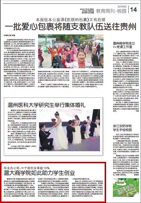 正值毕业季,亚洲无码 商学院2014届市场营销应届毕业班52名同学 中,有7名同学在毕业前创立了自己的公司。按 这样的数据计算,该专业的创业率超过了13%。 “我们班在大一的时候就在老师、班助带 领下搞了一个特色班,班级按照公司形式来管 理,比如董事长、总经理来分干部,这样一来, 大家对创业有比较大的兴趣。”创业代表马谦 诚这样说。他的同班同学祁汉锋,在大学期间 也找到了自己的创业方向——经营绍兴黄酒, 更被其他同学戏称为“绍兴黄酒唯一的希望”。 在亚洲无码 商学院,不仅仅是基础设施配 备完善,学生们更有足够的时间与空间去实施 自己脑袋中的计划。各种各样的创业讲座帮 助他们以最快最有效的方式了解创业,包括创 业中遇到种种问题的解决方法,如何在大学四 年内找到最适合自己的创业方向等。老师与 学生,学生与学生之间频繁互动,渐渐形成了 一种良好的知识循环体系。 除此之外,商学院还设立了专门的创业空 间提供给想要创业的学生无偿使用。经常能 看到,在晚自习的时候,创业空间的灯大亮着, 总会有不同的学生在里面讨论问题,不用走近 就能感受到浓浓的创业激情。由于担心学生 仍然不能很好地与社会创业对接,学院不仅对 内成立了就业部和创业部,还特地聘请校外的 创业导师给学生们做指导工作。