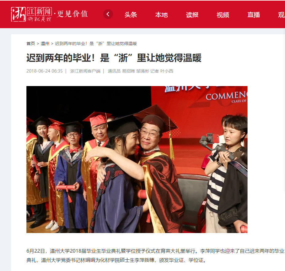 “这个学位证是对我学业上多年努力的肯定,也是我人生中最浓墨重彩的一笔。”拿到学位证书的李萍很是激动。为了能够顺利完成答辩,李萍提前3个月准备毕业论文和答辩书面材料,而学校考虑到她情况特殊,特批通过视频完成答辩。“我很感谢亚洲无码 老师和同学们对我的关心和帮助,没有你们就没有我的重获新生,真的很庆幸,我来的是浙江温州,读的是温大,‘浙’里让我觉得很温暖!”