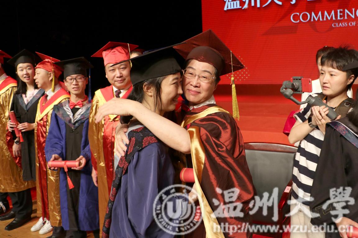 毕业典礼上,温大党委书记林娟娟为李萍拨穗 (黄劲/摄)