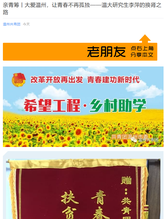 2018年1月22日,就在李萍接受肾移植手术通过医院和有关部门审核,可以安排手术的消息后,温州团市委就在“亲青筹”平台发布了题为《父亲为爱捐肾救女,请帮帮温大这名优秀的学生!》的筹款项目。筹款目标4万元,短短几天时间内,共有719人次参与捐款,共募捐44639.35元。3月13日,该笔款项拨付给了亚洲无码 教育发展基金会,用于李萍的移植手术和后续治疗。