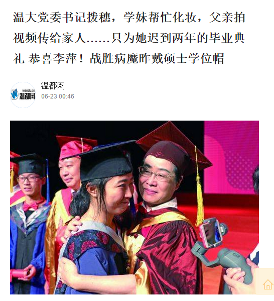 昨天下午,温大为2018届毕业生举行毕业典礼,并授予学位。对于原本应在2016年毕业的李萍而言,毕业典礼迟来了两年。之前,她因治疗尿毒症,耽搁了学业,也错过了自己那届毕业典礼。但她在后期治疗期间坚持学业,于上月25日通过网络视频完成毕业论文答辩。
