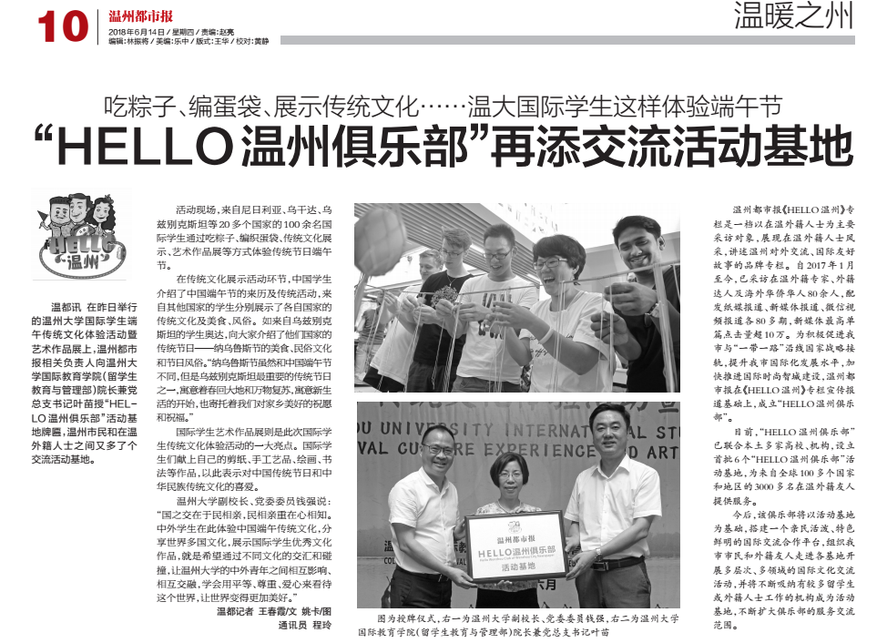 温都讯 在昨日举行的亚洲无码 国际学生端午传统文化体验活动暨艺术作品展上,温州都市报相关负责人向亚洲无码 国际教育学院(留学生教育与管理部)院长兼党总支书记叶苗授“HELLO 温州俱乐部”活动基地牌匾,温州市民和在温外籍人士之间又多了个交流活动基地。