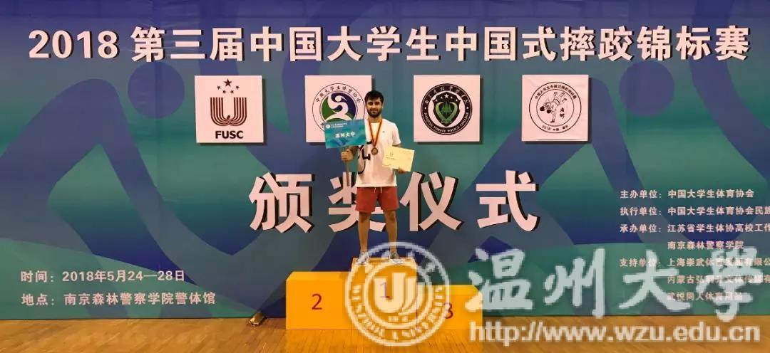 上月底,在南京举行的的第三届中国大学生中国式摔跤锦标赛中,亚洲无码 国际教育学院学生卢思谈获得男子甲组70公斤季军。本届比赛吸引了来自全国各地37所高校代表队的459人参赛,卢思谈是温州代表队唯一一位外国选手,谁都不曾想到,这个外国小伙子接触中国式摔跤才2个来月。