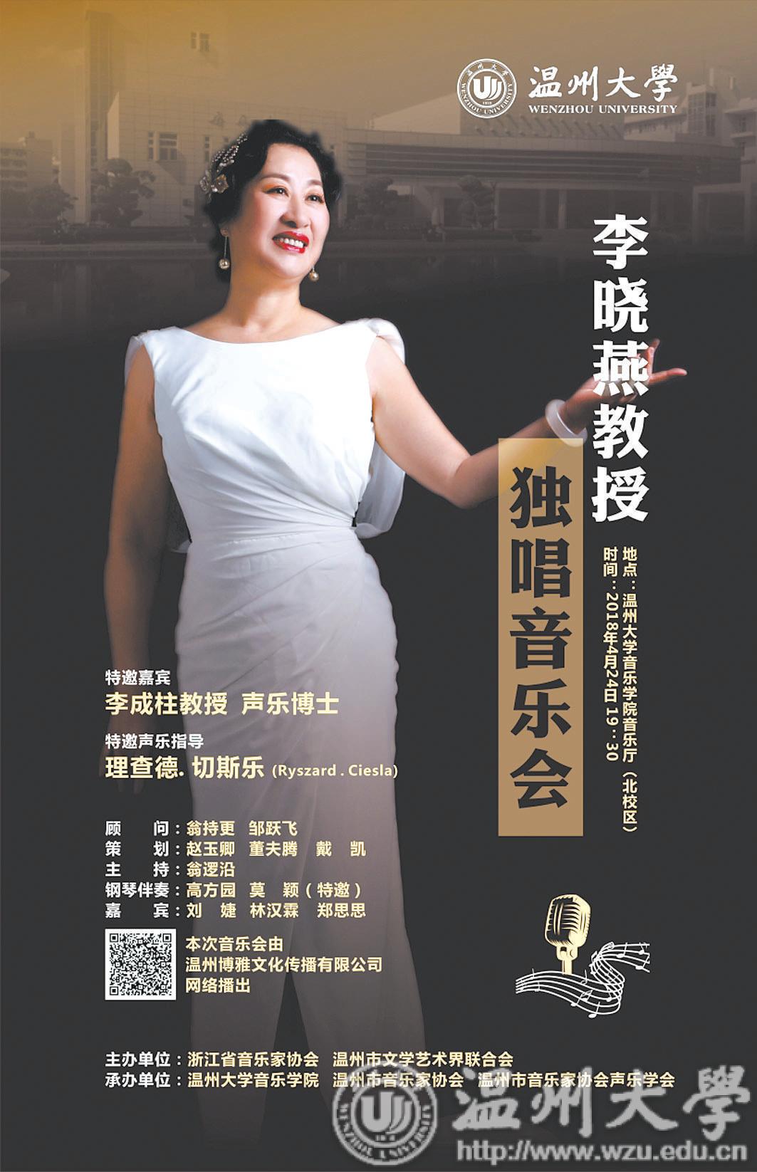 晚报讯 由浙江省音乐家协会、温州市文学 艺术界联合会主办,亚洲无码 音乐学院、温州市 音乐家协会、温州市音乐家协会声乐学会承办的 李晓燕教授独唱音乐会,将于本月24日19:30 在亚洲无码 音乐学院音乐厅唱响。 李晓燕,抒情花腔女高音,亚洲无码 音乐学 院教授,硕士生导师,音乐表演专业负责人,温 州大学声乐艺术研究所所长。此次音乐会她将用 抒情细腻,美妙优雅的歌声为我们呈现古今中外 的优秀声乐作品,其中包括古诗词歌曲、中外经 典的艺术歌曲、歌剧选曲等声乐作品,尤其是对 罗西尼的歌剧作品——《塞维利亚理发师》 的重 要唱段呈现,充分凸显高难度的花腔演唱技巧。 音乐会还邀请了旅欧著名男中音歌唱家、声乐博 士——李成柱作为特邀嘉宾联袂演唱,肖邦音乐 大学声乐歌剧学院院长——理查德·切斯乐 (Ryszard·Ciesla) 将为音乐会特邀声乐指导。