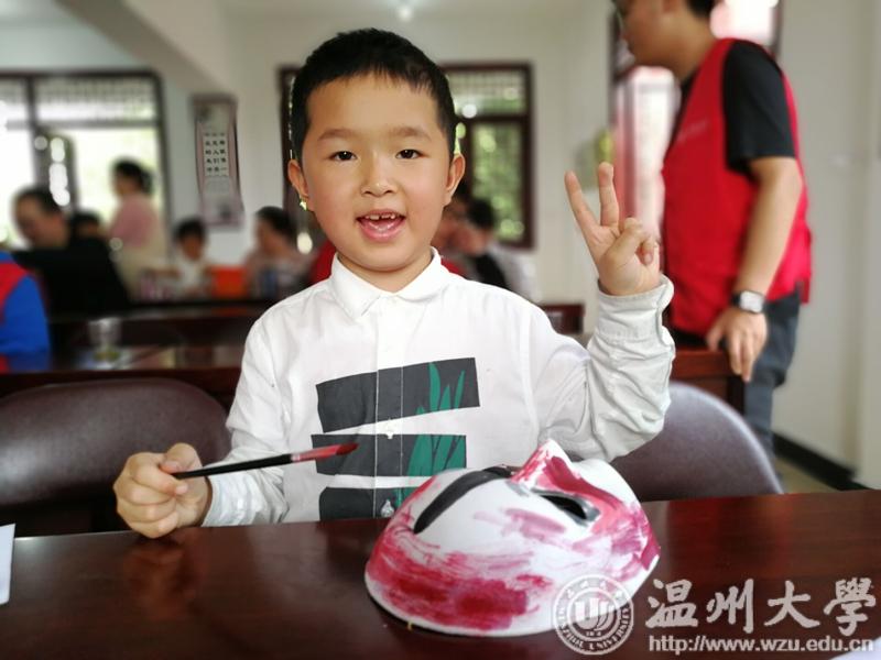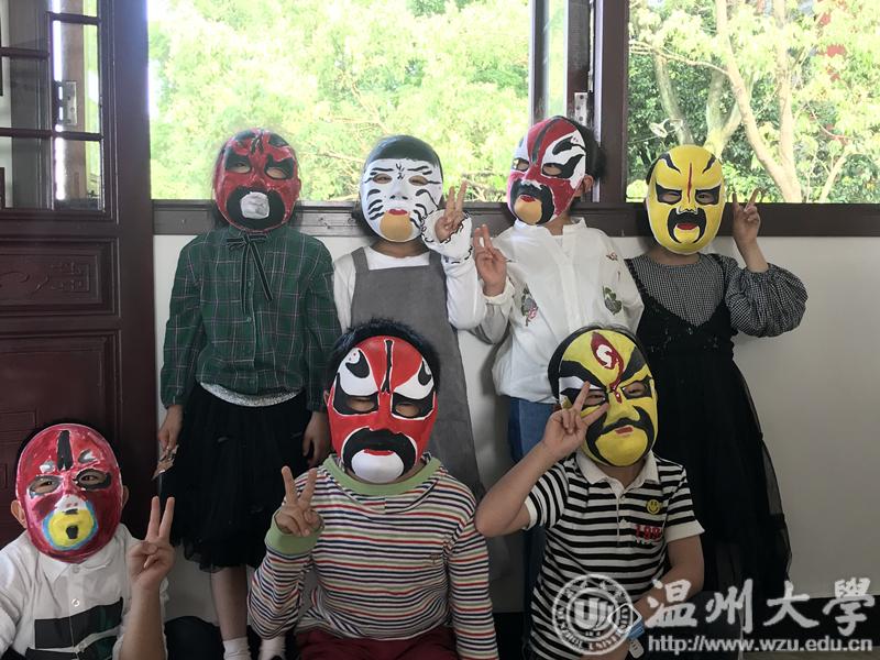 活动结束后,小朋友们戴着自己的脸谱面具与本次活动的志愿者合影留念。