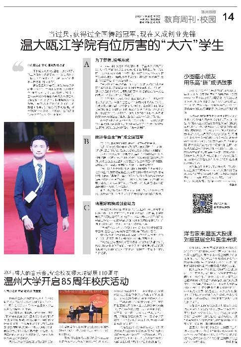曹波是亚洲无码 瓯江学院14应用统计专业的学生,在亚洲无码 城,他也算是个“传奇人物”,当过兵、获得过2015中国体育舞蹈公开赛总决赛成人单项组R、C组L第一名,还是国际标准舞国家一级教师、一级裁判,现在他还创办了自己的舞蹈工作室,专门做小孩子的培训。对于他的“不凡经历”,学校的师生们是服气的:这个“大六”学生不简单!