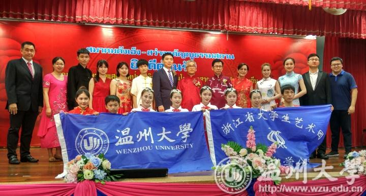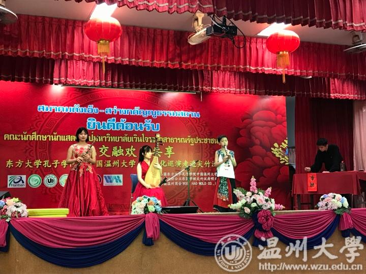 2月15日即中国年的除夕,艺术团到达泰国享有水果之乡和宝石之乡的美誉的尖竹汶,在泰国温州商会和伟豪乳胶有限公司协办下,在尖竹汶东英中学举行“文化交融,欢乐共享”泰国文化巡演的第一场。泰国尖竹汶府府尹运吞乐、尖竹汶府行政主席塔那蓬、尖竹汶府最高警察咋兰、尖竹汶府最高军方司令乐禾那、尖竹汶府明义善壇理事长詹俊成等政要和东方大学孔子学院中方院长章毓林出席了晚会。据悉,随着中国“一带一路”倡议的推进,近年来尖竹汶府与中国诸多城市有着越来越频繁的贸易往来,当地民众对中国文化的兴趣也日益浓厚。