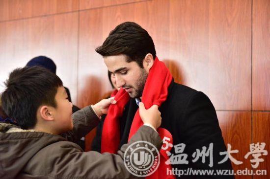 学生向结对的国际学生送上象征吉祥如意、红红火火的大红围巾。 校方提供