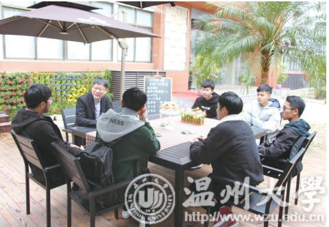 温大溯初学区的户外咖啡吧内,一场“寝室导师下午茶”正在进行——温大党校办主任蔡联群正与 C8-104 宿舍的 6 位学生开展主题为“说说大学生活”的开放式交谈。围成一圈的同学们神情专注,又时而放声大笑。“上课与老师会有一些距离感,在这里却没有这种感觉,喝着咖啡,能够和老师像朋友一样聊天,像室友一样亲切地交谈,共同讨论面临的一些问题,感觉很开心。”教师教育学院的陈竺伟同学说。