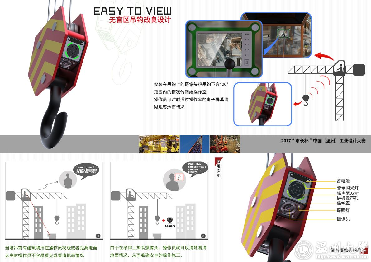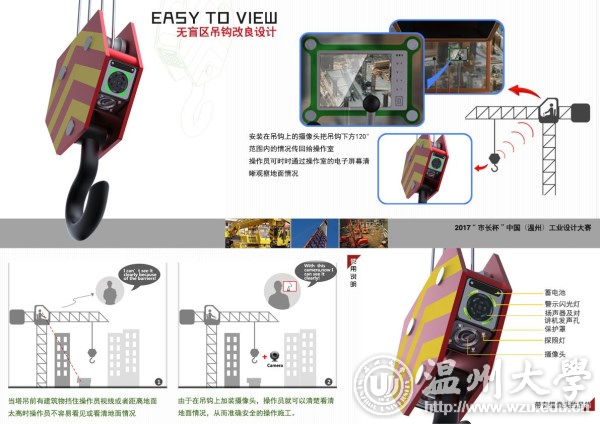 该小车用于启发儿童对编程的兴趣,以实体积木代表抽象的程式码,同时具有画图机器人天生的理性和乐高积木的感性。这款作品的目标不仅仅限制在编程教学上,更希望能让儿童了解数学基础,在玩乐中潜移默化地培养逻辑思维能力。 YCQ9M系列双电源自动切换装置 李其利 供电连续性是电力质量的一个重要方面,自动转换开关的重要性日益凸显,需要实现智能化、小型化、可靠安全,并兼顾美观和方便。该装置采用最新的工业设计理念,充分利用平面分割,产生合理的空间感,选用黑色为主色调,使产品简洁高雅,摆脱传统电气粗笨的视觉形象;大弧面设计,凸显简单与个性;操作区和指示区合理划分,让视觉尽量舒朗,产品功能清晰,更加方便用户的使用。 创意类金奖—— 无盲区吊钩改良设计 李春宇