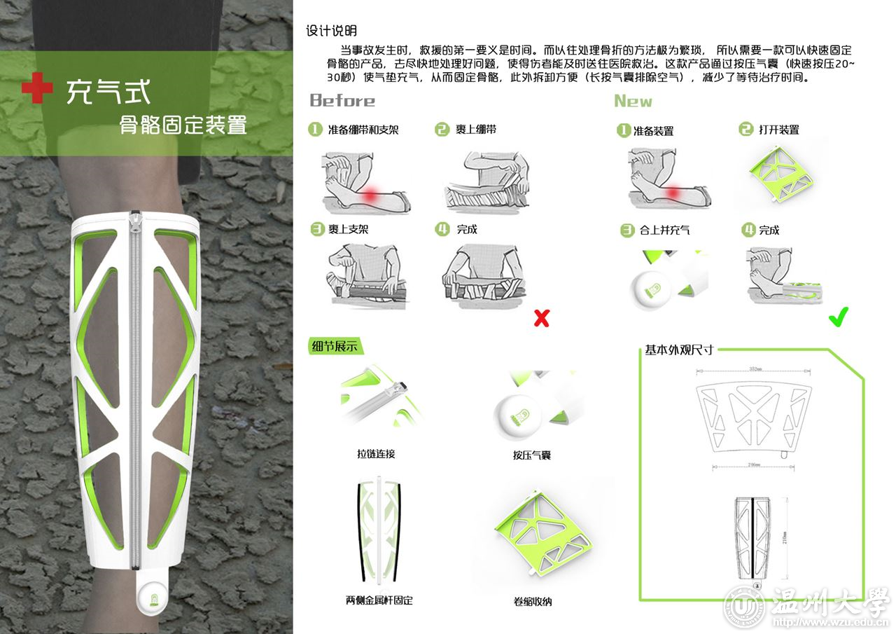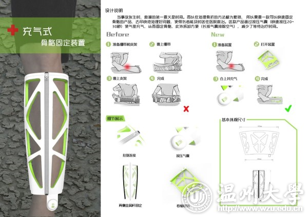 作为建筑工地的核心设备,塔吊是大型建筑工地必不可少的重型机械装备。一台安全好用的塔吊是出色完成建筑任务的主要前提。但目前的塔吊机械存在一个关键问题,就是当塔吊和地面建材之间有建筑物遮挡时,操作员就会看不到地面情况,从而导致不必要的损坏和时间的浪费。针对这一问题,设计了这款实用新型吊钩。通过安装在吊钩上的无线摄像头和操作室的电子显示屏相互配合,操作员可以清楚地看到地面情况,并通过吊钩上的对讲机和地面人员沟通,从而快速准确的操作施工。 创意类银奖—— 充气式骨骼固定装置 陈锦成