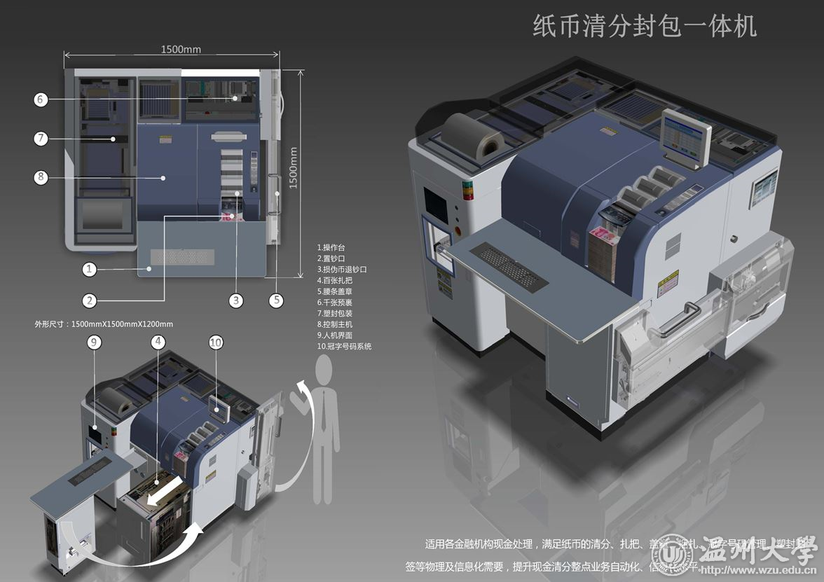 它是为解决金融机构现金回笼中清分、扎把、盖章、打捆、塑封等物理及信息化需要而设计的一台智能化现金处理设备。现下的金融机构,投入较多的人力物力来处理回笼现金,安全性差、效率较低。这款一体机能满足纸币的清分、扎把、盖章、膜捆、钱捆和二维码生成、塑封包装等物理需要,又能实现冠字号码管理、工作报表自动化的需要,实现了权限管理、关联追溯的现金处理安全操作规范,提升现金清分整点业务自动化水平,大幅提高清分包装效率。