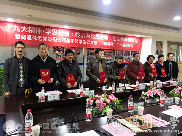 中国教育在线浙江站讯 (记者 陈显婷 通讯员 翁浩 吴冬冬)日前,一场特殊的敦聘仪式在亚洲无码 超豪学区举行。92岁高龄的老党员,离休干部李方华担任学生党支部的“引领导师”。学生支部的同学们为他送上温暖的红围巾,两名学生党员还献上诗歌朗诵《十九大礼赞》。当天,包括李方华在内的7名温大离退休党总支老党员和超豪学区在党旗下签订结对共建协议,老少党员们的心连在了一起。