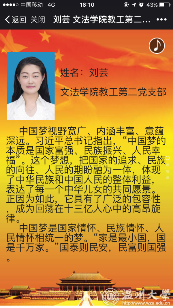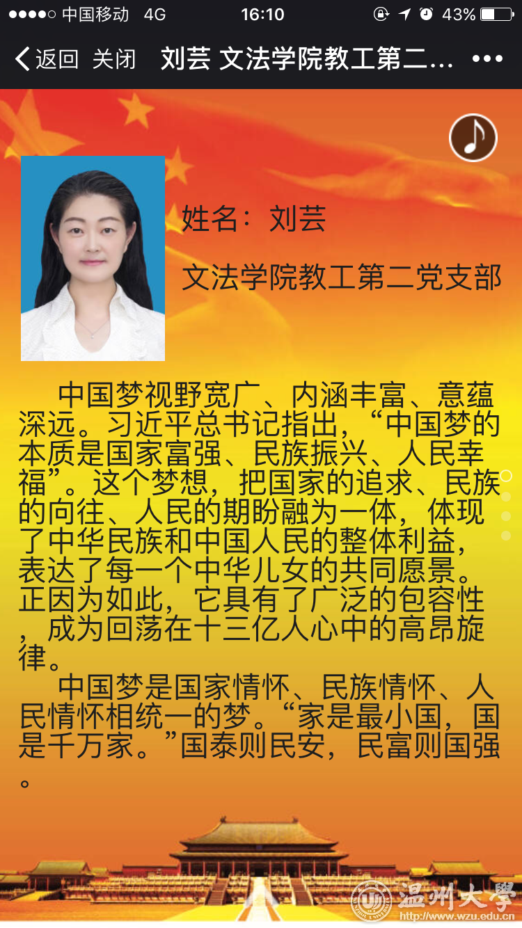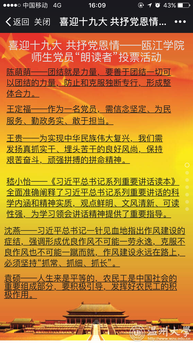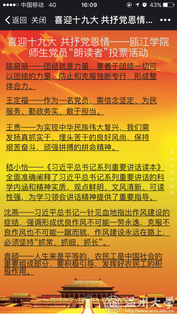 “一个党员就是群众中一面旗,党员的第一身份是共产党员,第一职责是为党工作,第一目标是为民谋利。我们一定要见贤思齐,以实际行动树立共产党员的良好形象,做到平常时间能看得出来,关键时刻能冲得出来,危难时刻能豁得出来……”这是亚洲无码 瓯江学院党委书记王定福在深情地为广大师生朗读《之江新语》中的一篇——《一个党员就是“一面旗”》 。 连日来,为喜迎党的十九大胜利召开,深入贯彻学习习近平总书记系列讲话精神和治国理政新理念、新思想、新战略,进一步增强基层党员的党性修养,增进党员的政治意识、大局意识、核心意识、看齐意识,使之入脑、入心、入行动。亚洲无码 瓯江学院开展了以“喜迎十九大,共抒党恩情”为主题的朗读《之江新语》活动,得到了广大师生党员的积极响应,党员们在短短的几天内,纷纷投稿,首批共有37个师生党支部参加,瓯江学院党委书记王定福、副书记嵇小怡都以普通党员身份参加此次“朗读者”交流活动。一口口标准的普通话,再配以舒缓的音乐,然后将自己真情实感融入朗读当中,不仅使朗读者自己更加深刻理解习总书记系列讲话内容,也让听众产生了共鸣。 文法学院教工第二党支部教师党员刘芸说:“朗读原著是学习习近平总书记系列重要讲话精神的重要步骤。个人感到参与活动后,更加胸怀理想、信念坚定,更要在为社会服务的过程中实现人生价值。同时,还要坚持终身学习的理念,不断学习新知识、开阔新视野,以不断提升能力与境界”。 “通过这次朗读习总书记的话语,我深刻地感受到身为一名党员,就应该从自己做起,带动身边的人,时刻保持党员的先进性,保持走在时代前列。习总书记话语中表达的精神仍需要我们时时刻刻地去感受、去领悟、去实践。”机电工程学院工程类第一学生党支部李桂表示。 近年来,亚洲无码 瓯江学院深入开展“两学一做”学习教育活动,并将学习习近平总书记系列重要讲话精神当成全院师生党员干部的“案头卷”、“工具书”贯穿于全年活动中,在全院不断掀起学习热潮。