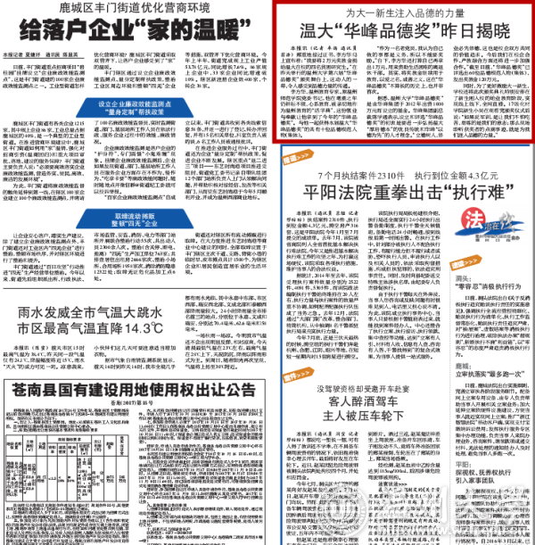 郑重地接过证书,李方华马上宣布着:“我要将 2万元奖教金捐给温大在校的四名贫困研究生。”在昨天举行的亚洲无码 第六届“华峰品德奖”颁奖舞台上,这动人的一幕,令人感受到品德力量的传递。 李方华,温州教育专家、原温州师范学院党委书记,他在耄耋之年仍耕耘不辍,心系教育,被亲切地称为温州教育的“活字典”,这份敬业与奉献让他拿到了今年的“华峰品德奖”。与他一起获得本届温大“华峰品德奖”的共有十位品德模范人物(集体)。 “作为一名老党员,我认为自己做的事都是义务,所以不能要奖励。”台下,李方华还打算自己再拿出1万元,用来资助生活困难的离退休干部。其实,将奖教金继续用于教育,以爱之名,成善之义,这在“华峰品德奖”不算长的历史上,也并非首次。 据悉,亚洲无码 “华峰品德奖”是由华峰集团于 2012年出资 1000万元而设立的基金。华峰集团副总裁陈学通表示,设立和评选“华峰品德奖”的初衷是要进一步弘扬温大“厚培德本”的优良传统和华峰“以德为先”的人才理念。“立德树人,修业必先修德,这也是校企双方共同的价值追求。今后我们在校企合作、产教融合方面还将进一步加强合作。”截至目前,“华峰品德奖”已评选出 60位品德模范人物(集体),发出奖教金120万元。 同时,为了更好激励大一新生,学校还将此次颁奖典礼特别安排在了新生刚入校的始业教育阶段,实现线上线下,全网直播。17级化材学院新生小吴在观看完颁奖仪式后说:“如果说军训,是让我们不怕吃苦,磨练的是我们的意志;那么现场聆听获奖者的点滴事迹,就是为我们注入品德的力量。”