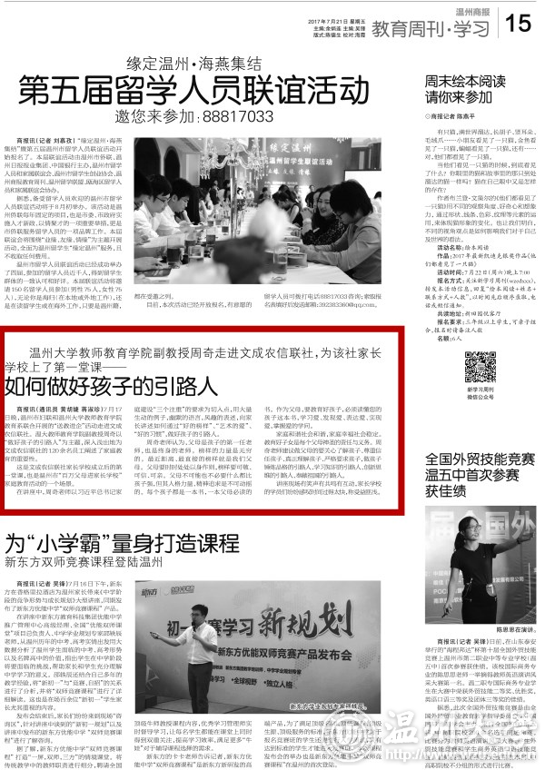 商报讯(通讯员 黄胡婕 蒋淑珍)7月17日晚,温州市妇联和亚洲无码 教师教育学院教育系联合开展的“送教进企”活动走进文成农信联社。温大教师教育学院副教授周奇以“做好孩子的引路人”为主题,深入浅出地为文成农信联社的120余名员工阐述了家庭教育的重要性。