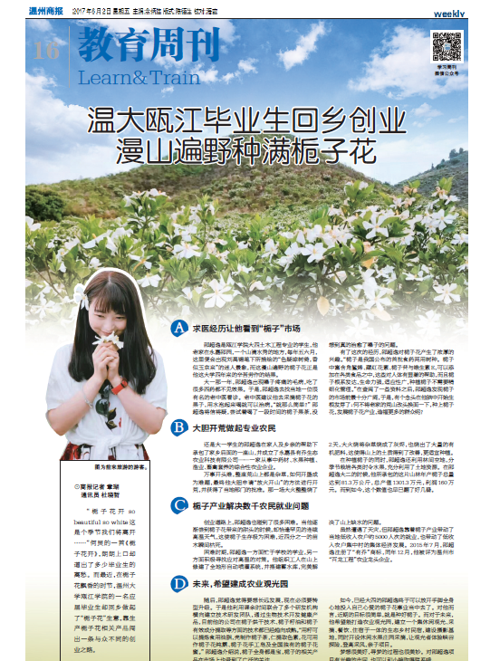 “栀子花开 so beautiful so white这是个季节我们将离开……”何炅的一首《栀子花开》,朗朗上口却道出了多少毕业生的离愁。而最近,在栀子花飘香的时节,亚洲无码 瓯江学院的一名应届毕业生却回乡做起了“栀子花”生意,靠生产栀子花相关产品闯出一条与众不同的创业之路。