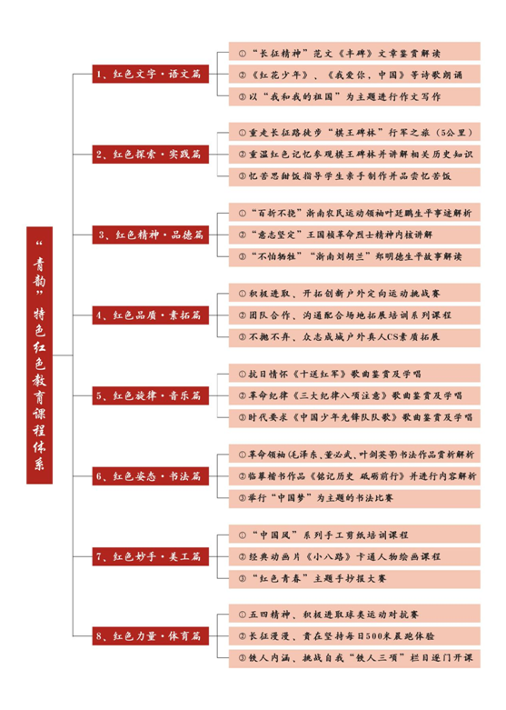 课程体系设置上的全面性。以往红色教育往往以专门课程或是偏重于一两门课程的形式传递给广大青少年,且有流于形式化的倾向,为传递红色文化而传递红色文化,无法以一种全面立体的作用持续影响学生、感染学生。本次实践队力图拓展红色文字之语文课、红色科学之实验篇、红色旋律之音乐篇、红色姿态之书法篇、红色力量之体育篇、红色情怀之朗诵篇、红色妙手之美术篇、红色精神之品德篇、红色探寻之实践篇。(详见下图)